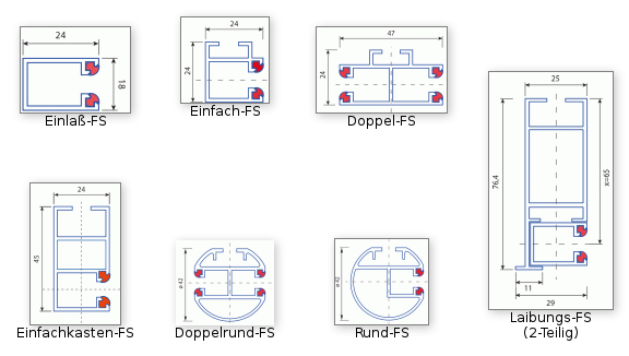 Die Kopfleisten sind bei allen Modellen gleich groß (57×51 mm), sowie auch die Unterleiste (85×20 mm). Alle drei nachfolgenden Modelle können entweder per Kurbeloder elektrisch (auch per Funk) bedient werden. Die Antriebswelle besteht zu 100 % aus Aluminium-Vollmaterial.